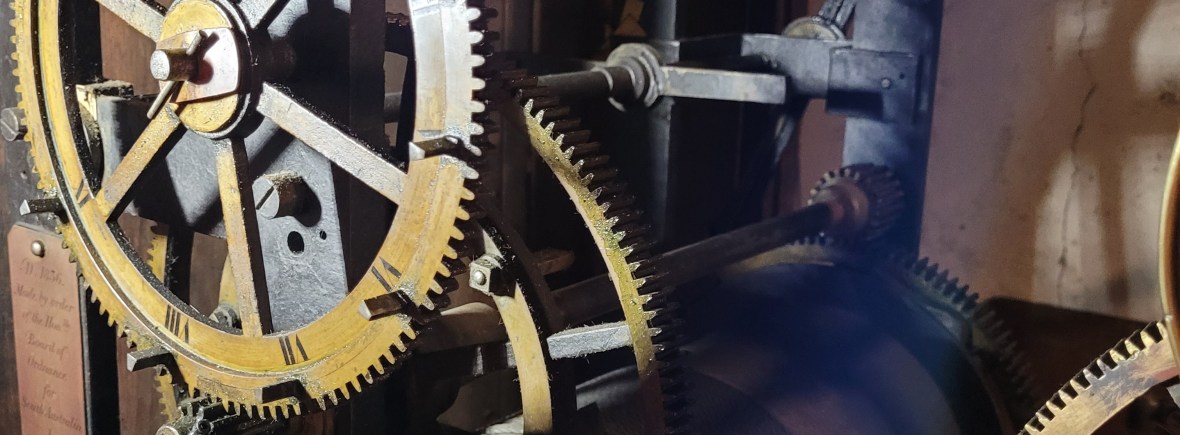 Our Horologists (ancient clock carers) have the tools and knowledge to repair turret clocks. Bryan Crosby and Malcolom Stevens maintain the oldest continually operating clock in South Australia.